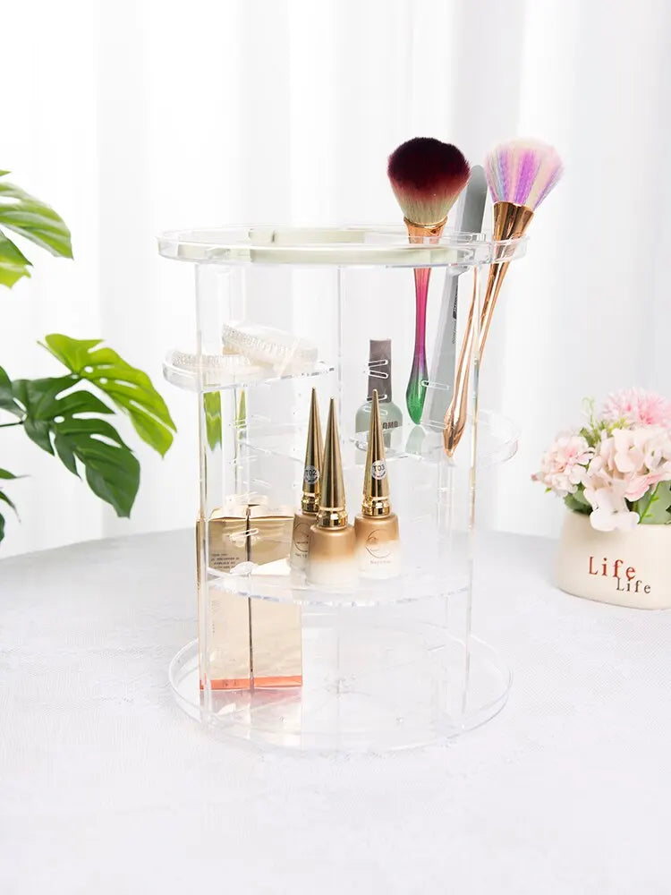 Versatile in its application, this organizer accommodates makeup essentials, brushes, lipsticks, nail polish, skincare products, and jewelry with ease. Keep your countertop, dresser, vanity, bedroom, dressing room, kitchen, and bathroom impeccably tidy. Experience the perfect blend of functionality and style with our innovative 360° Rotation Acrylic Organizer – simplifying your daily routine with sophistication.